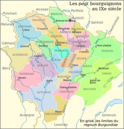 Il faut bien comprendre que le Duché de Bourgogne est constitué de plusieurs comtés (pays ou pagi, zone géographique souvent autour d’une ville), qu’il ne faut pas confondre avec le Comté de Bourgogne (territoire approximatif de ce qui deviendra la Franche-Comté), qui regroupera seulement quatre pagi à partir de 982.