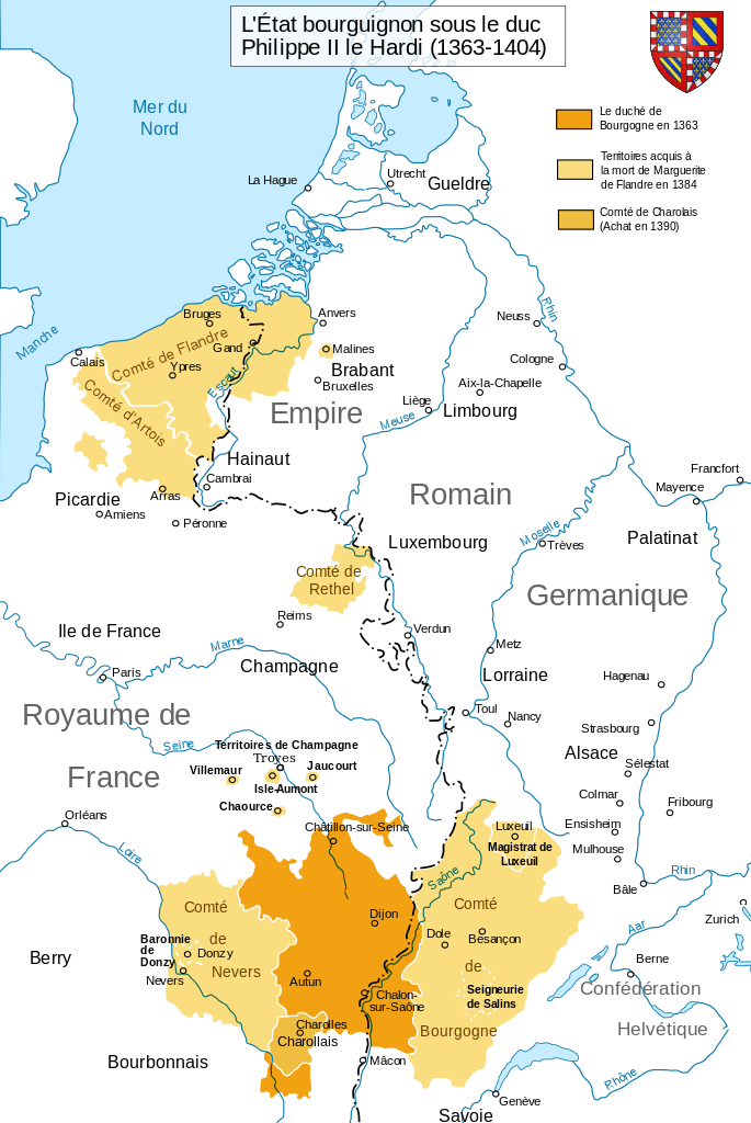 En effet, par son mariage avec Marguerite III de Flandre en 1369, Philippe le Hardi agrandit le Duché de Bourgogne, puisque Marguerite était l’héritière des comtés de Flandre, d’Artois, de Nevers et du Comté de Bourgogne. Ainsi, Comté et Duché de Bourgogne sont à nouveau réunis sous la même bannière.