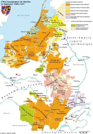 En 1467, à la mort de Philippe le Bon, son fils aîné Charles de Valois-Bourgogne, dit Charles le Téméraire, lui succède. A son tour, il rêve d’unifier ses possessions pour constituer un royaume entre France et empire germanique.
